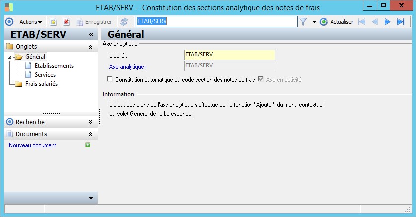 Cette zone permet d'indiquer si la détermination du code section (concaténation des différents centres analytique à raison d'un centre par plan analytique de l'axe) est automatique ou non.- Lorsque cette case n'est pas cochée, il n'y a pas de ventilation analytique.- Lorsque cette case est cochée, la détermination du code section en saisie de notes de frais est automatique et s'effectue sur la base de (des) l'attribut(s) défini(s) dans la zone "Information reprise en tant que valeur de centre analytique". |