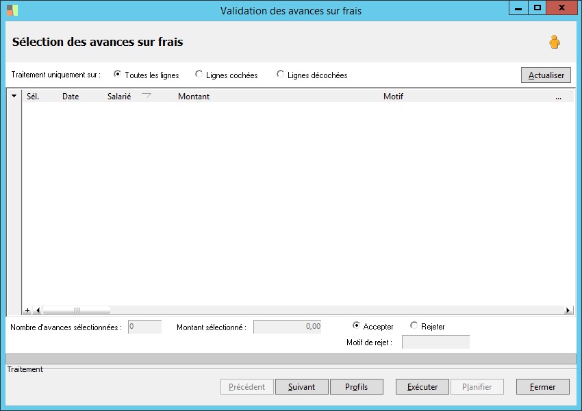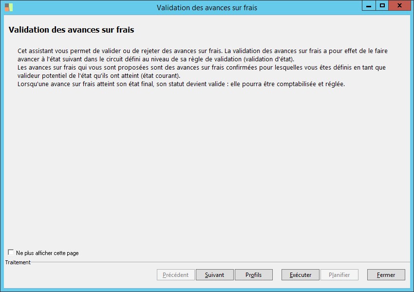 (Sage FRP 1000 Comptabilité) Menu Notes de Frais > Avances sur frais > Validation des avances sur frais