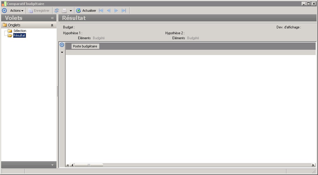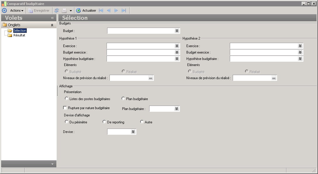 L'entrée Sélections permet de sélectionner les deux hypothèses que vous souhaitez comparer et de définir le mode d'affichage (présentation des postes par liste, ou par plan budgétaire?).