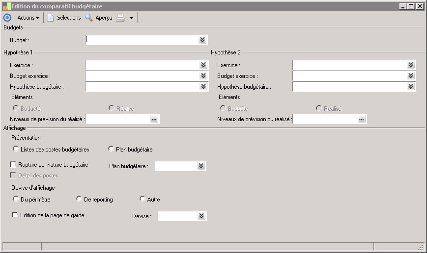 Sélectionnez les deux hypothèses que vous souhaitez comparer (panneaux Budgets , Hypothèse 1 et Hypothèse 2 ), le niveau de réalisé que vous souhaitez prendre en compte, puis définissez le mode d'affichage (présentation des postes par liste, ou par plan budgétaire?).