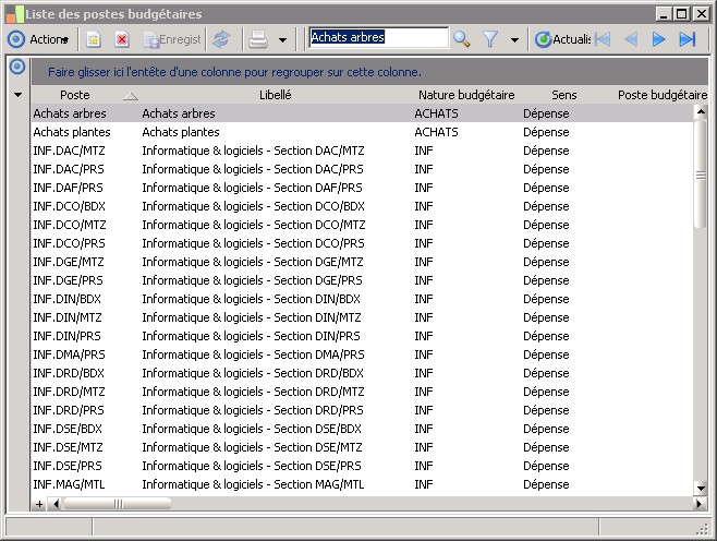 (Sage FRP 1000 Suite Financière) Menu Budget > Paramètres > Liste des postes budgétaires