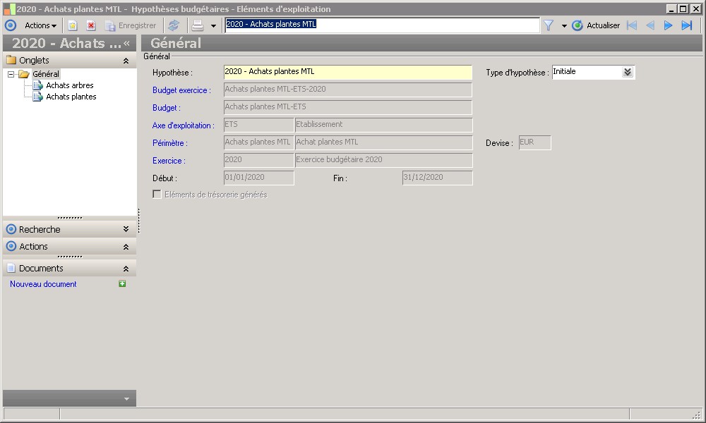 (Sage FRP 1000 Suite Financière) Menu Budget > Analyses > Hypothèses budgétaires - Eléments d'exploitation