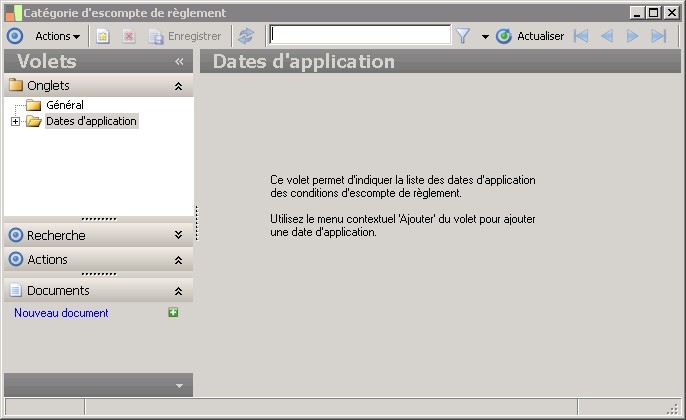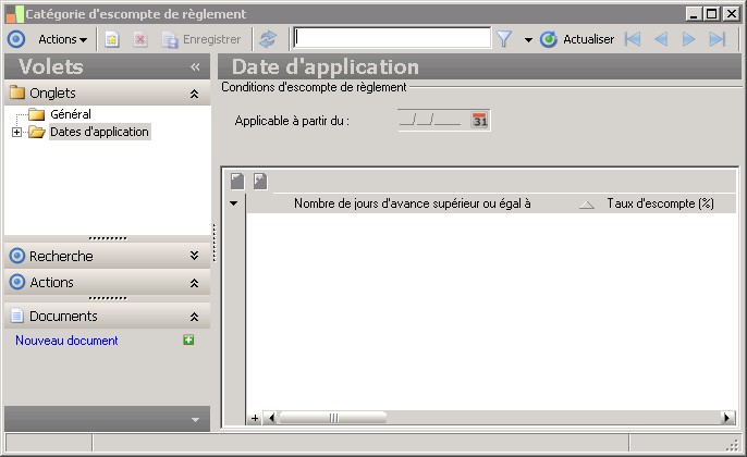 Cette zone indique la date de début de validité des conditions d'escompte pour la catégorie d'escompte de règlement. |