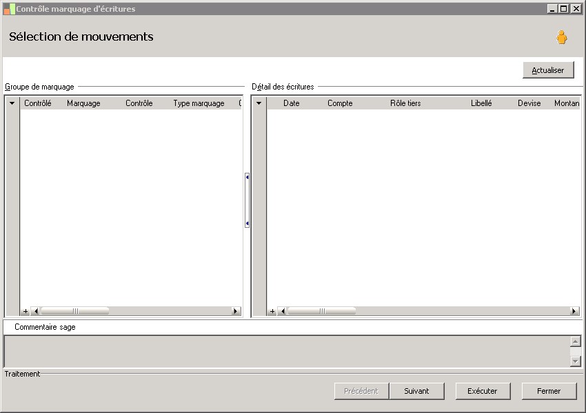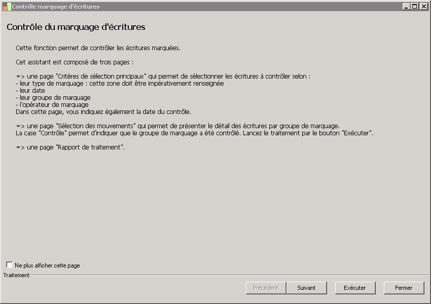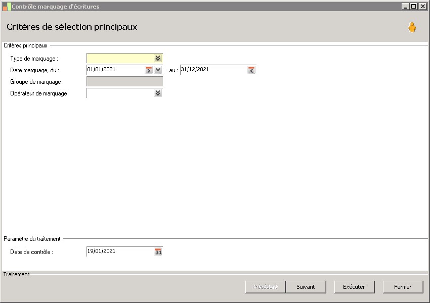 (Sage FRP 1000 Suite Financière) Menu Comptabilité > Auxiliaire > Marquage > Contrôle marquage d'écritures