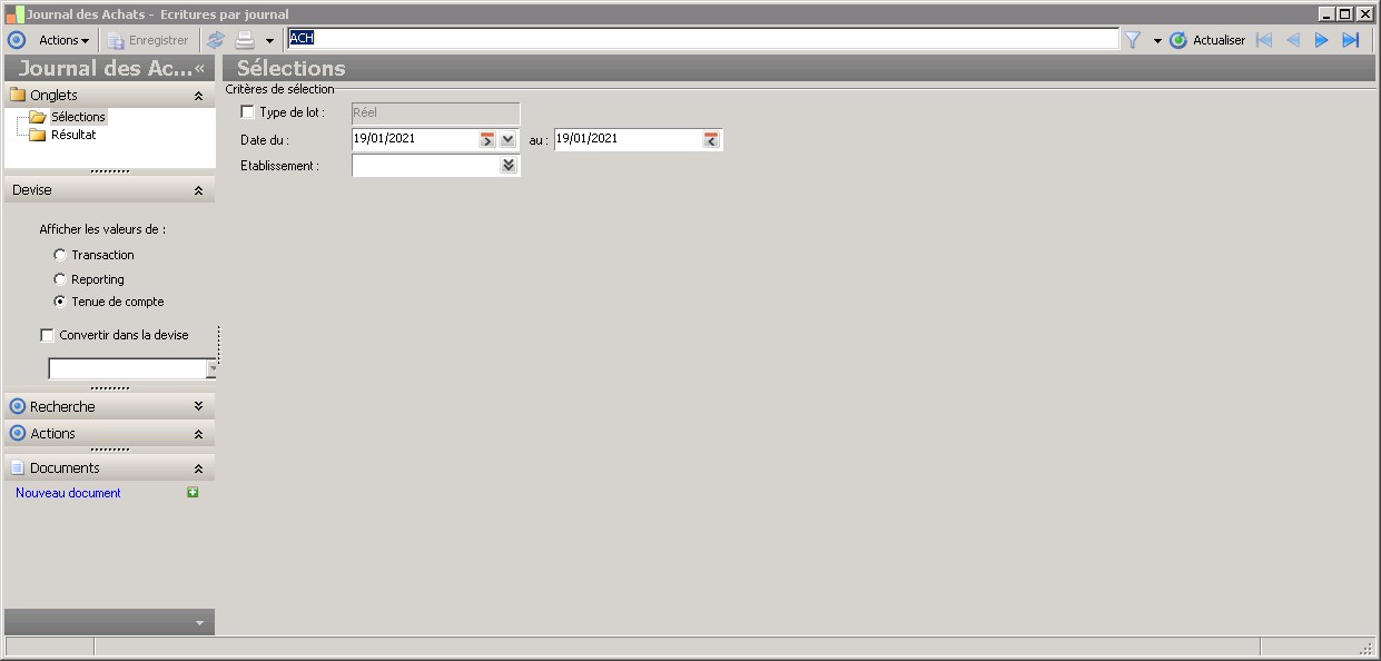 (Sage FRP 1000 Suite Financière) Menu Comptabilité > Générale > Interrogations / consultations > Ecritures par journal