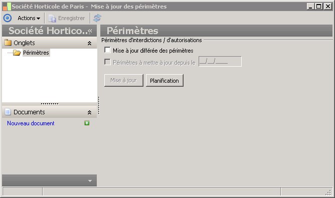 Option permettant de différer la mise à jour des périmètres d'interdictions ou d'autorisations lorsqu'un éléments des périmètres (compte, société, ...) est modifié.La mise à jour des périmètres peut se faire manuellement ou être planifiée. |