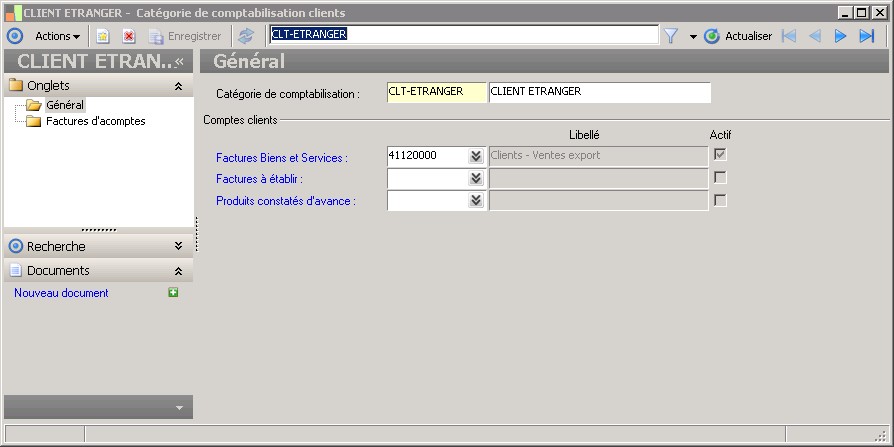 (Sage FRP 1000 Suite Financière) Menu Processus Opérationnels > Paramètres > Clients > Catégorie de comptabilisation clients