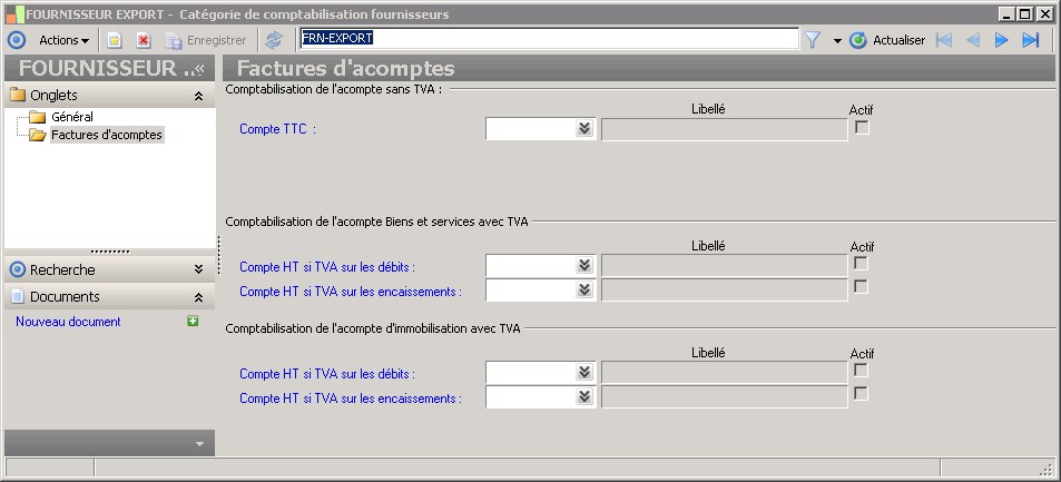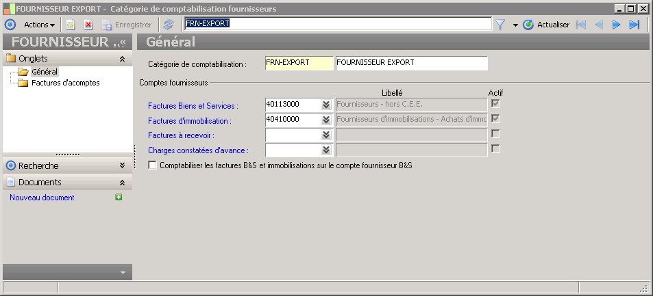 (Sage FRP 1000 Suite Financière) Menu Processus Opérationnels > Paramètres > Fournisseurs > Catégorie de comptabilisation fournisseurs