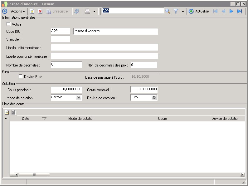 Cette zone indique le cours principal de la devise. Lorsqu'aucun cours à date n'est trouvé pour cette devise, c'est ce cours principal qui est utilisé.