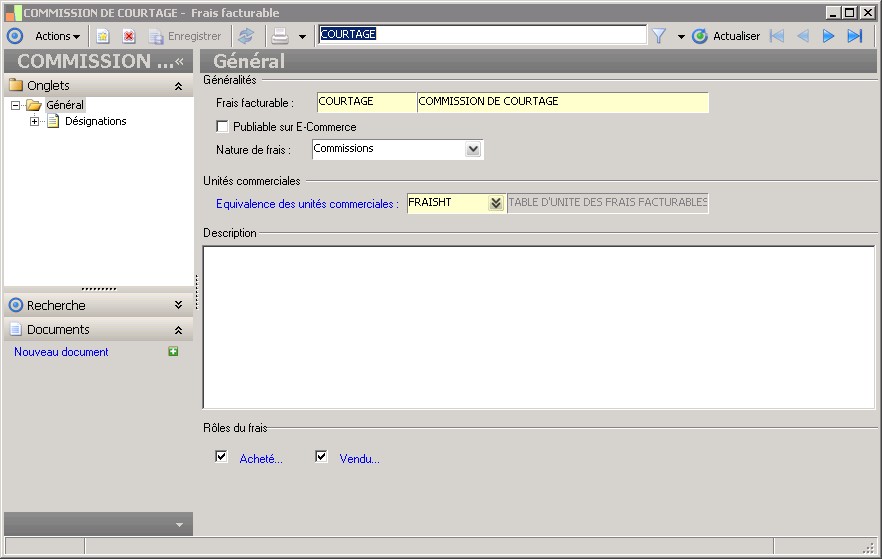 La nature de charge est définie uniquement pour les produits de type frais facturables.Elle permet d'établir la nature des charges qui doivent être associées au frais dans le cadre d'une définition des coûts d'achat et de revient par le biais d'une structure de coût |