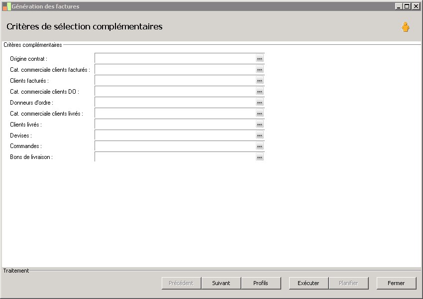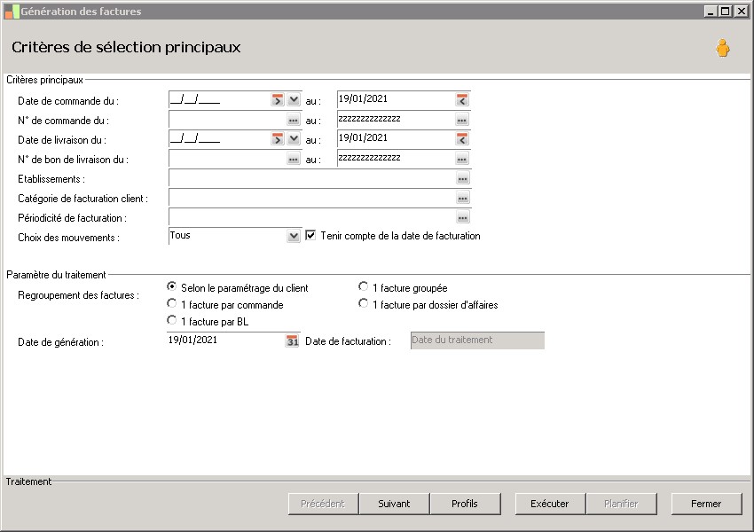 Cette fenêtre sert à l'enregistrement des critères de sélection pour la génération des commandes client en facture. Lorsque cette fonction est lancée depuis le menu Actions d'une commande, le programme propose les informations concernant la commande.