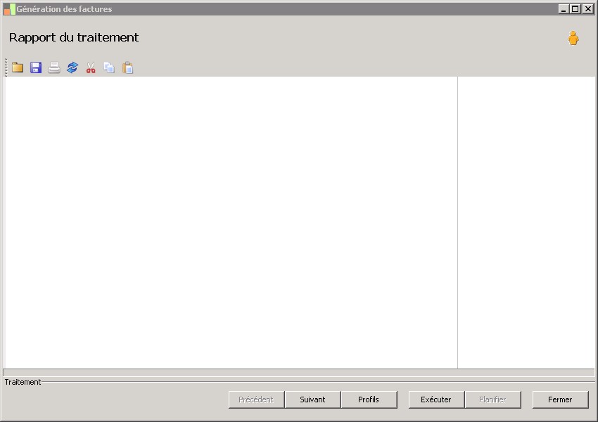 Cette fenêtre apparaît automatiquement après l'exécution de la fonction. Elle affiche les opérations conduites par le programme, en particulier les numéros de factures générées, et, éventuellement, les anomalies constatées. Dans ce cas, il est nécessaire de corriger ces anomalies et de relancer le processus pour générer les factures non générées.