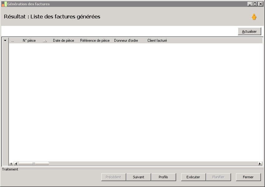 Actualiser fait apparaître la liste des factures clients ayant été générées avec les références de la pièce correspondante.