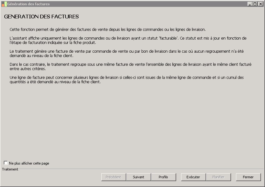 - de la commande Génération / Générer facture par assistant du menu Actions de la fenêtre de saisie des commandes de vente,