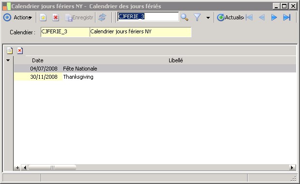 (Sage FRP 1000 Suite Financière) Menu Processus Opérationnels > Paramètres > Généraux > Calendrier des jours fériés