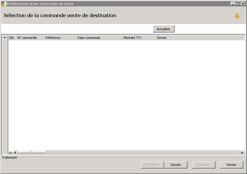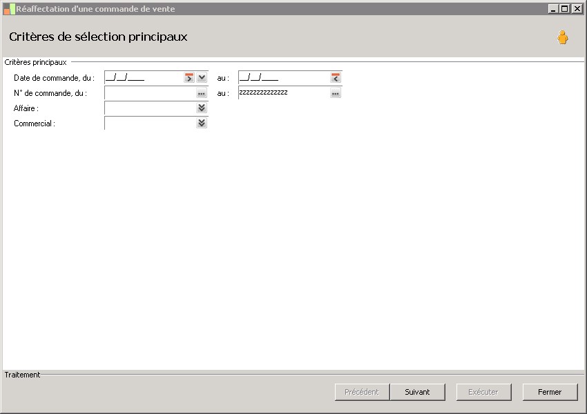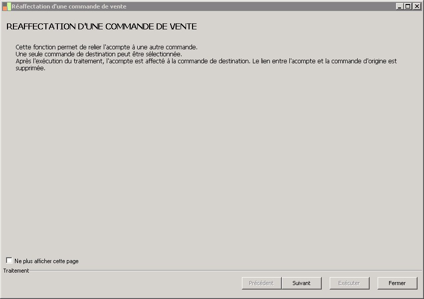 (Sage FRP 1000 Suite Financière) Menu Processus Opérationnels > Ventes > Commandes > Réaffectation d'une commande de vente