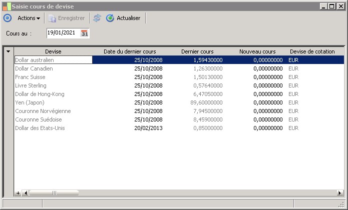 (Sage FRP 1000 Suite Financière) Menu Processus Opérationnels > Paramètres > Généraux > Saisie cours de devise