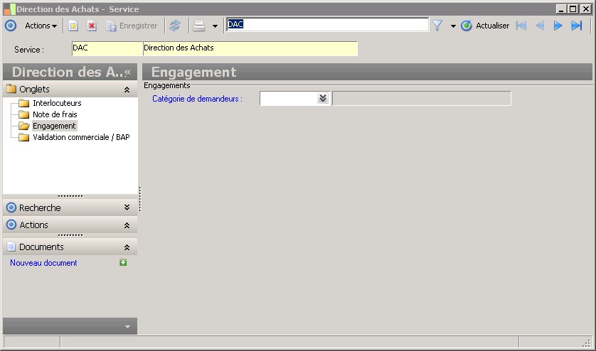 Cette zone permet d'indiquer la catégorie de demandeurs du service. Cette catégorie permet de déterminer la nature de validation des circuit de validation des pièces commerciales en fonction de l'origine de la demande (Personne, Service, Département, etc...). |