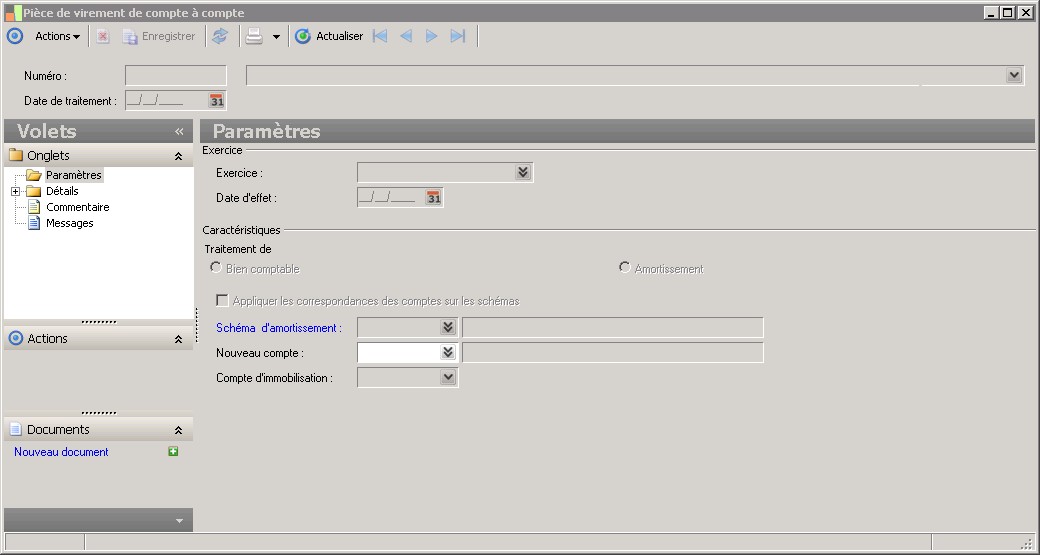 (Sage FRP 1000 Suite Financière) Menu Immobilisations > Suivi comptable > Biens > Pièce de virement de compte à compte