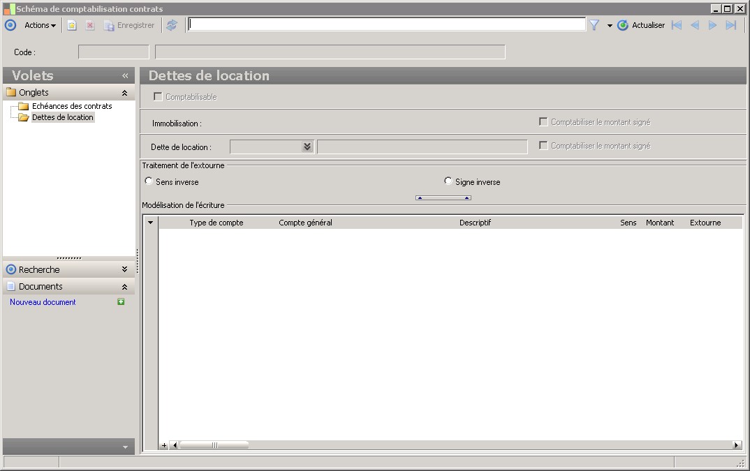 (Sage FRP 1000 Suite Financière) Menu Immobilisations > Fichiers de base > Schéma de comptabilisation contrats