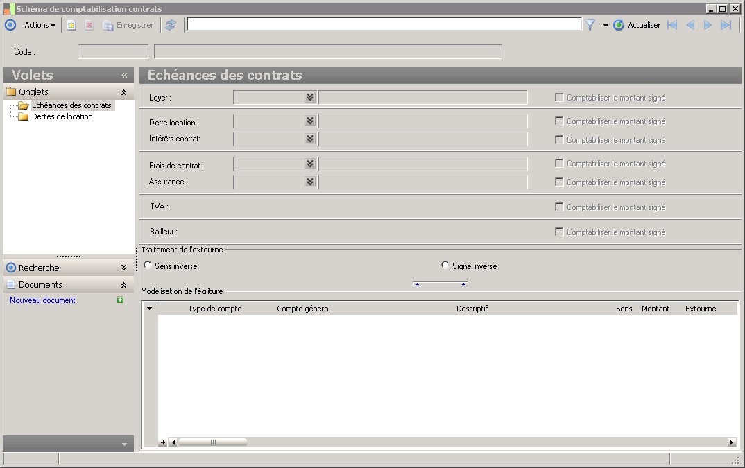 Attention, vous devez impérativement renseigner tous les comptes d'un schéma de comptabilisation, y compris ceux qui n'apparaissent pas comme étant obligatoires. Ceci est nécessaire pour le traitement de comptabilisation des échéances et dettes de location. |