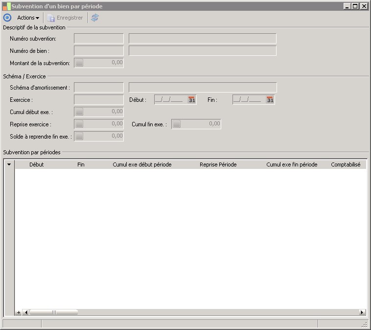 (Sage FRP 1000 Suite Financière) Menu Immobilisations > Suivi comptable > Biens > Subvention d'un bien par période