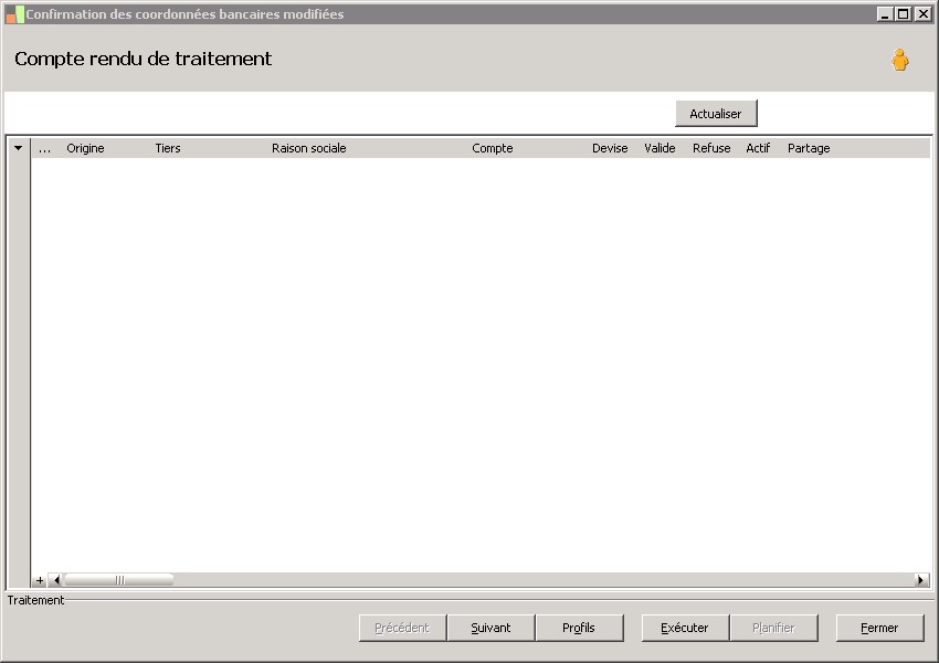 (Sage FRP 1000 Suite Financière) Menu Banque Paiement > Relevés et Notifications > Relevés de coordonnées bancaires > Confirmation des coordonnées bancaires modifiées