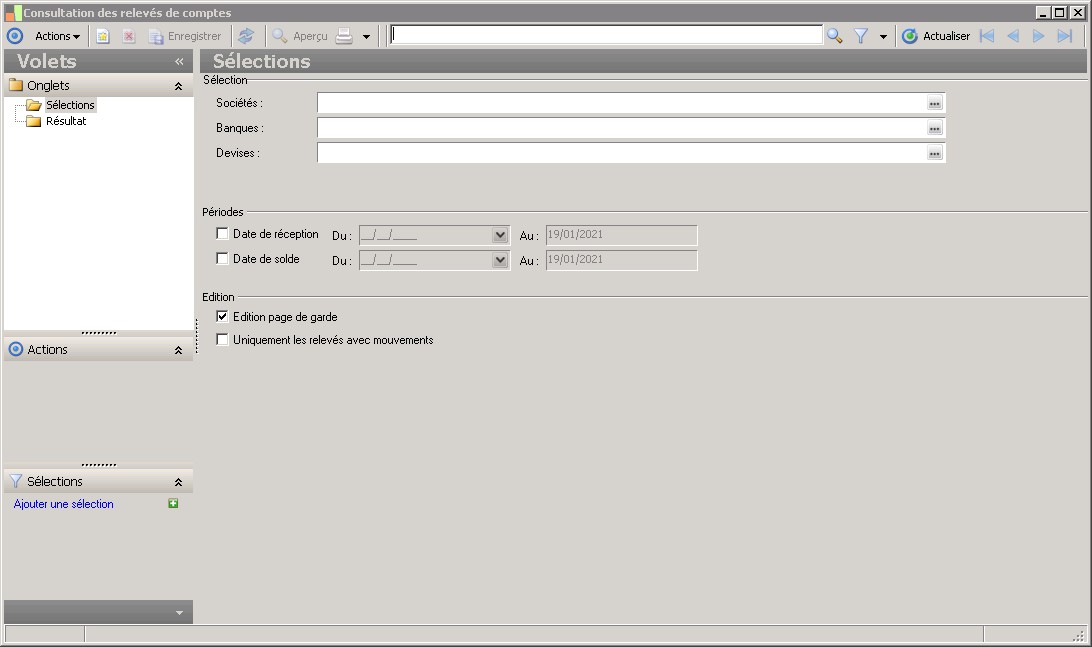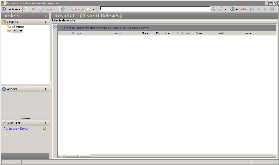 (Sage FRP 1000 Suite Financière) Menu Banque Paiement > Relevés et Notifications > Relevés de comptes > Consultation des relevés de comptes