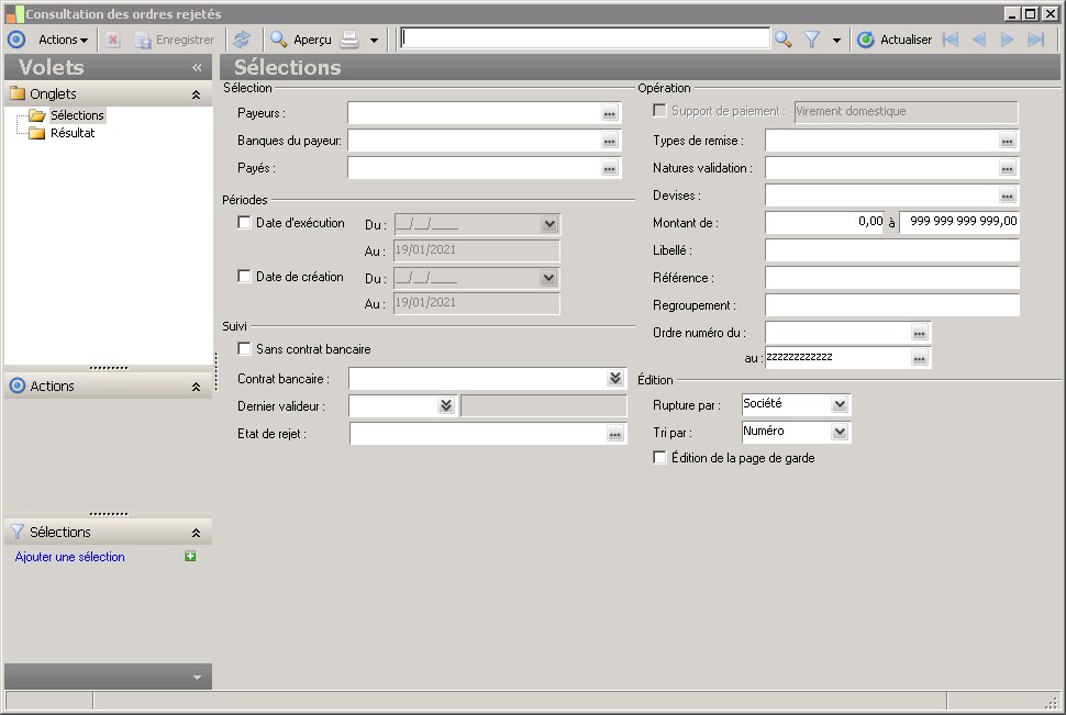 (Sage FRP 1000 Suite Financière) Menu Banque Paiement > Ordres bancaires > Consultation des ordres rejetés