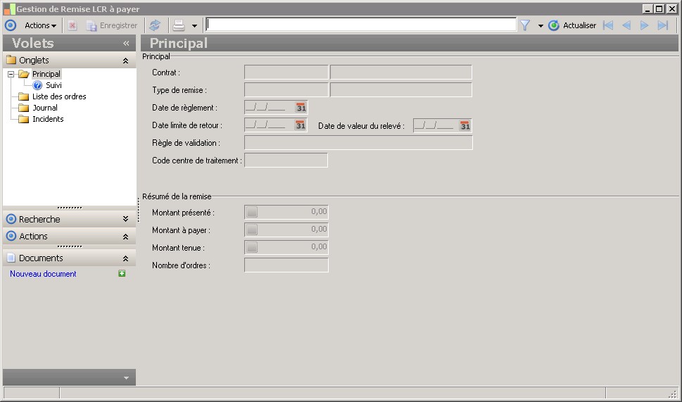 Cette classe référence l'ensemble des LCR à payer (Traites ou billets à ordre)Les LCR à payer sont émises par la banque et intégrées dans Sage 1000 Banque paiement afin d'y être traitées. Les LCR à payer issues d'un même fichier d'intégration sont constitutives d'une même remise bancaire. Le traitement d'une LCR à payer consiste à soit valider son paiement (total ou partiel) soit indiquer le refus de paiement (rejet). Ce traitement s'effectue dans le cadre du circuit de validation de la remise (validation des remises LCR à payer).La remise ne peut être envoyées à la banque qu'à partir du moment où son état final est atteint. Il est possible de n'envoyer à la banque que les remises présentant une ou plusieurs LCR refusées ou payées partiellement (notion d'accord tacite pour les LCR à payer défini au niveau du contrat bancaire). |