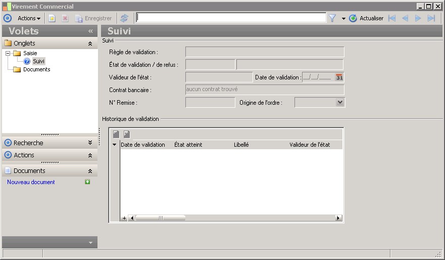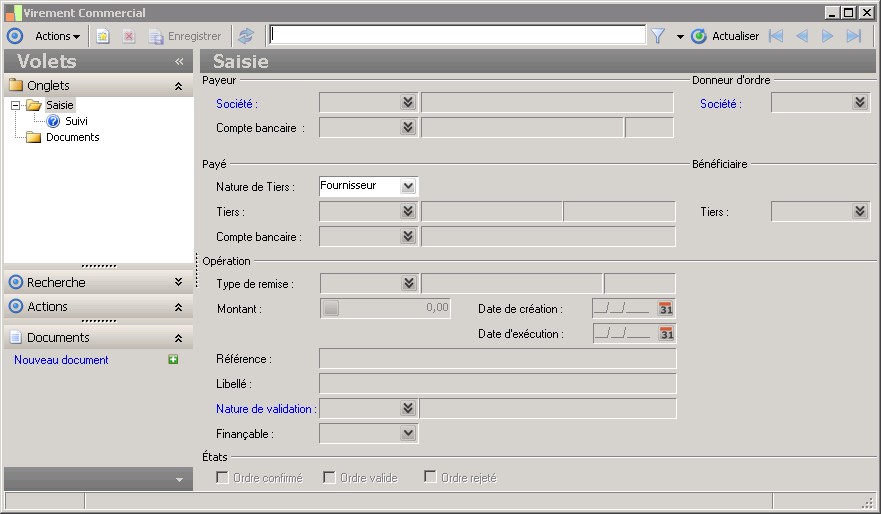 La nature de validation détermine la règle de validation qui sera liée à l'ordre. La nature est elle même déterminée par le groupe de validation associé au rôle du tiers de l'ordre.En l'absence d'une nature de validation, un ordre confirmé est considéré comme valide et peut faire l'objet d'une remise bancaire. |