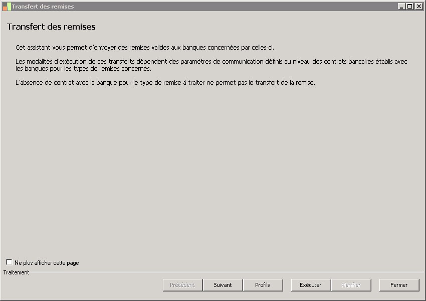 (Sage FRP 1000 Suite Financière) Menu Banque Paiement > Remises bancaires > Transfert des remises