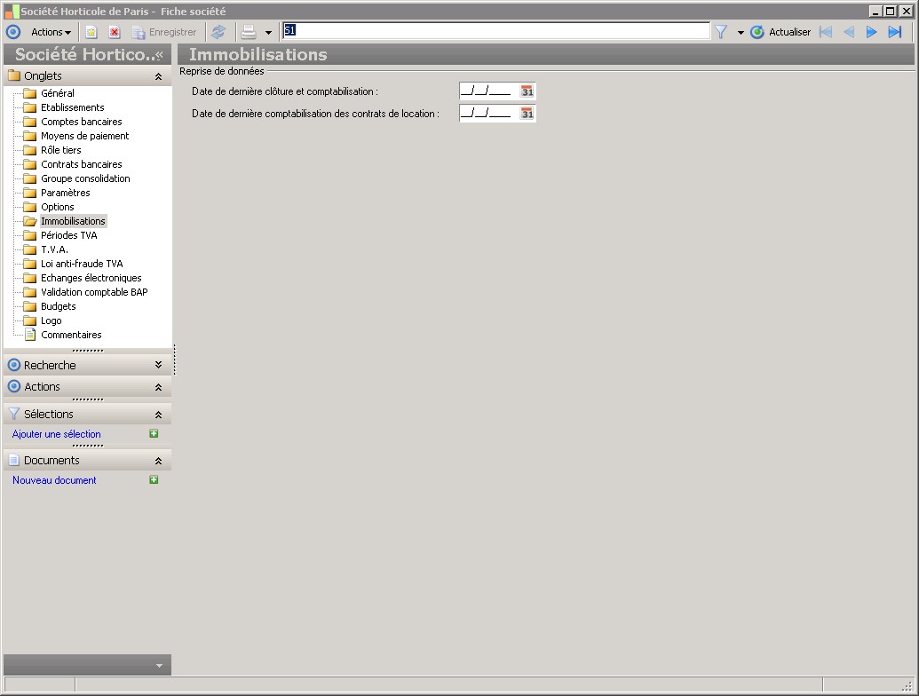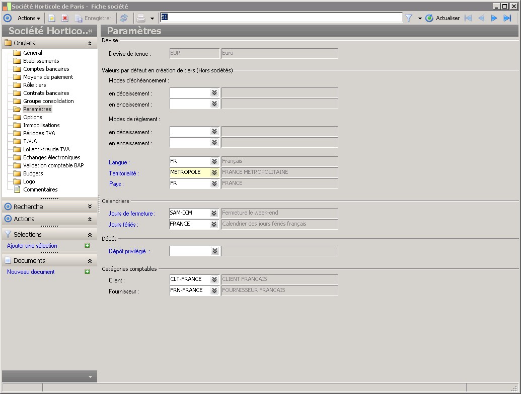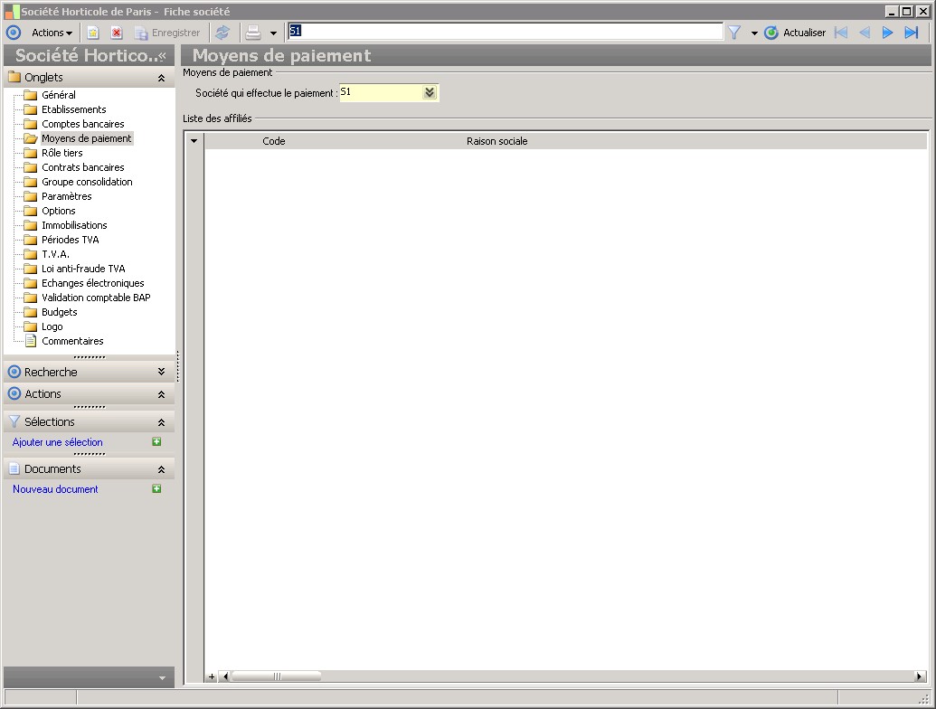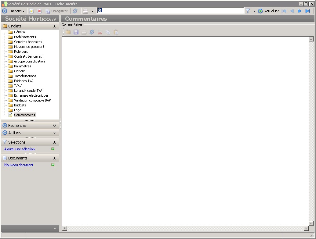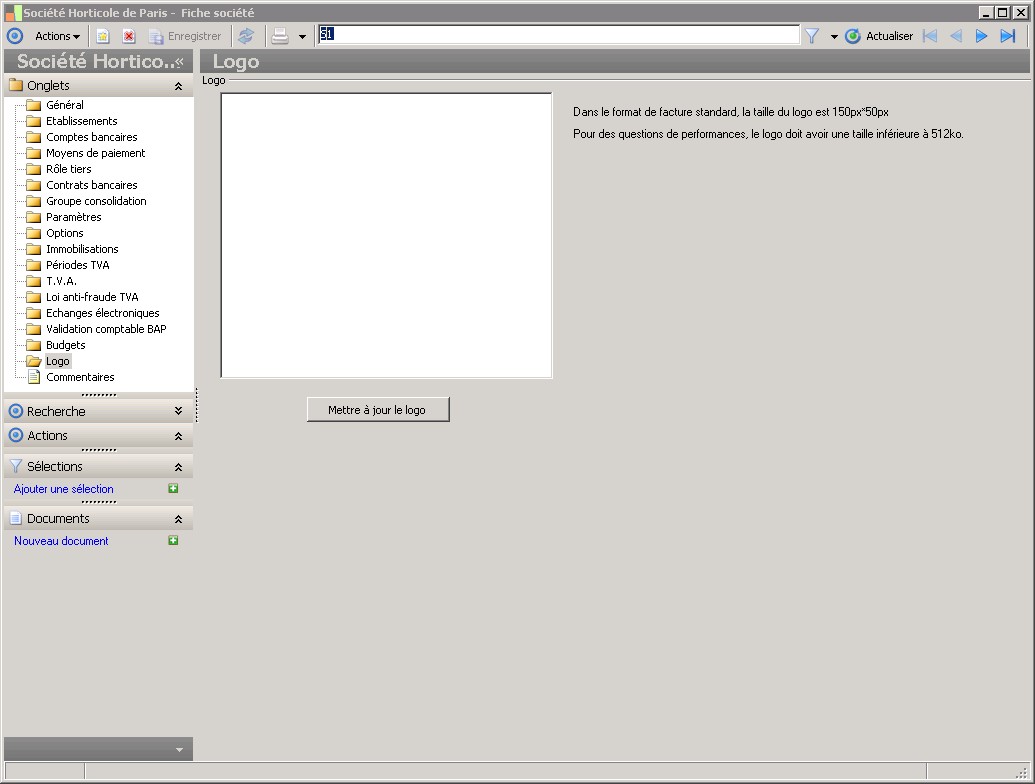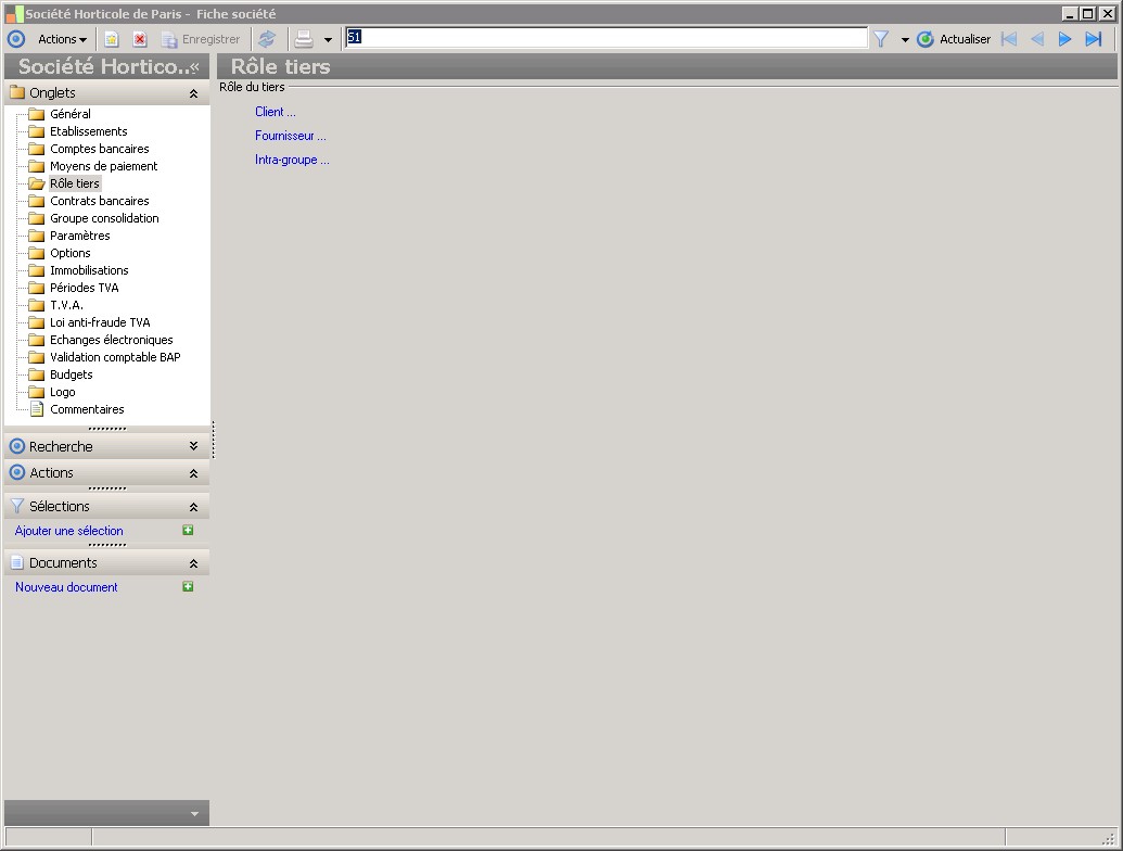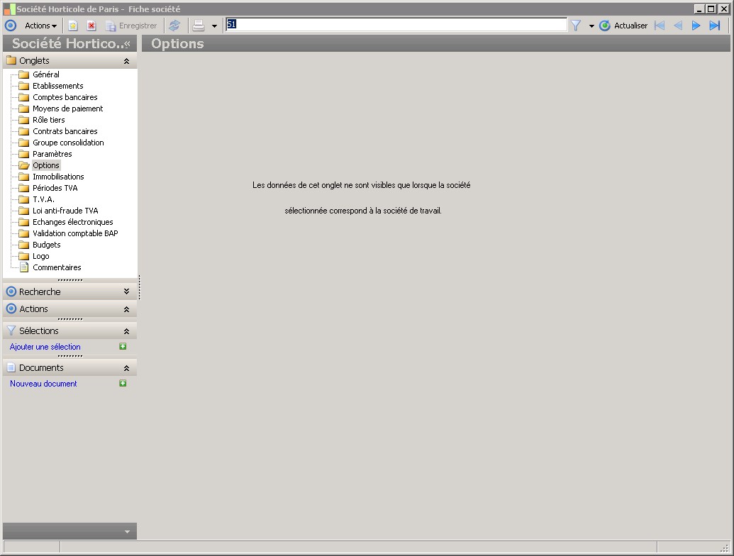 Dans la fenêtre Fiche société, la présence des fonctions décrites dans ce contexte dépend des applications installées. |