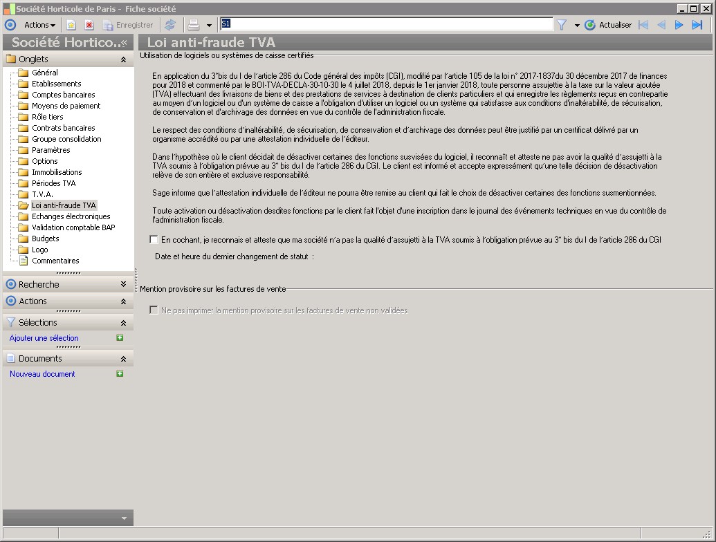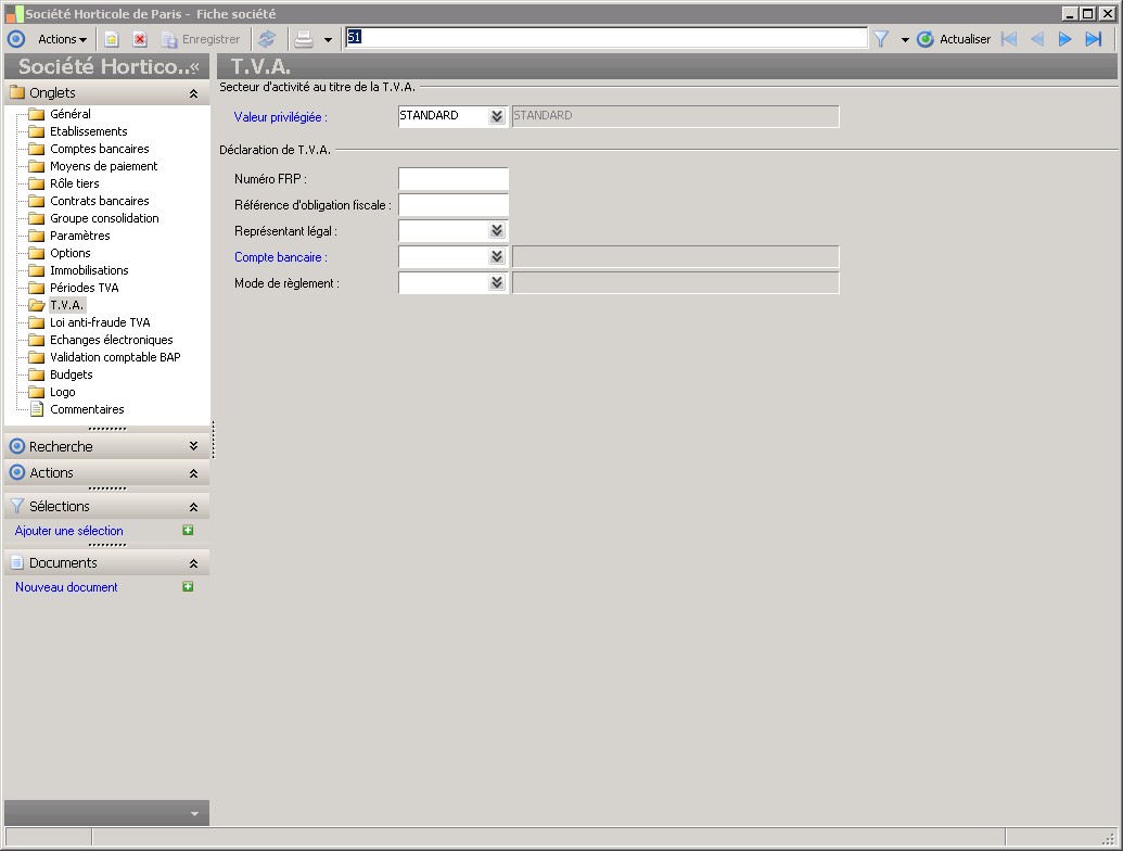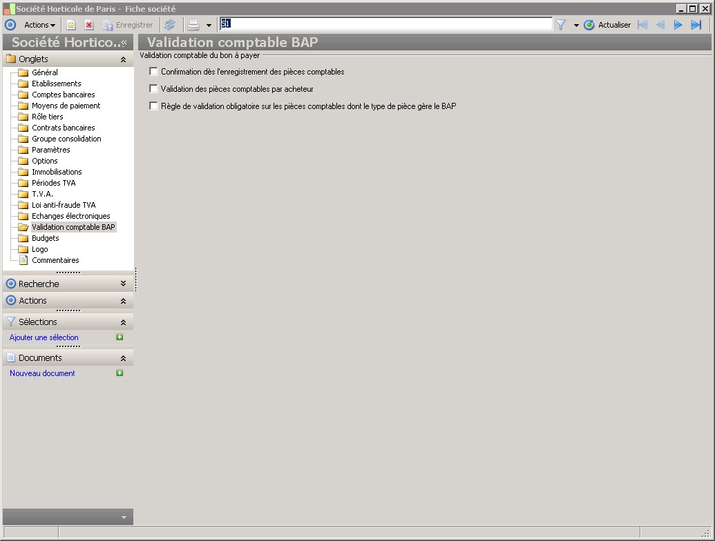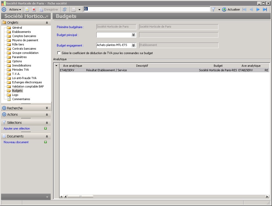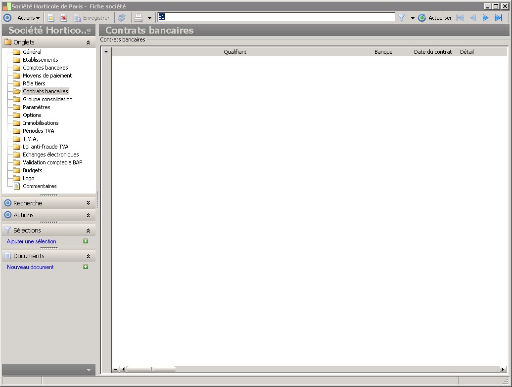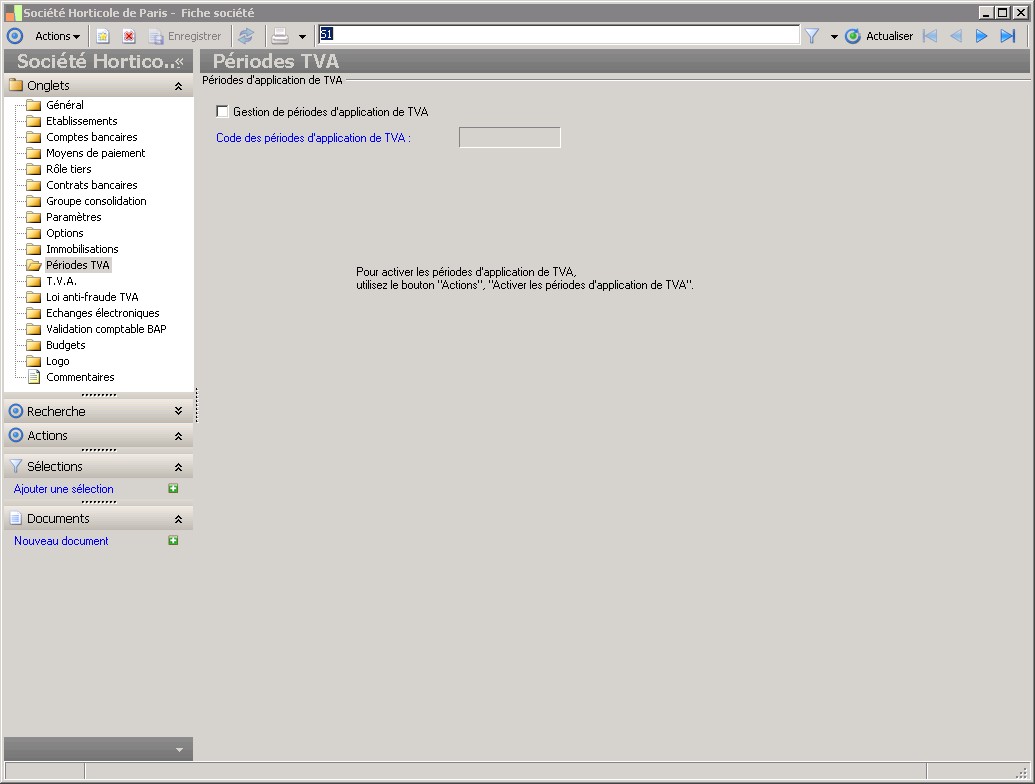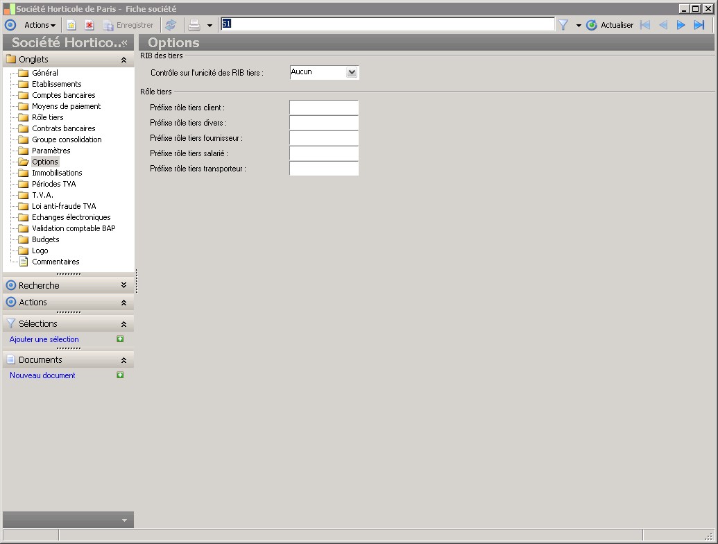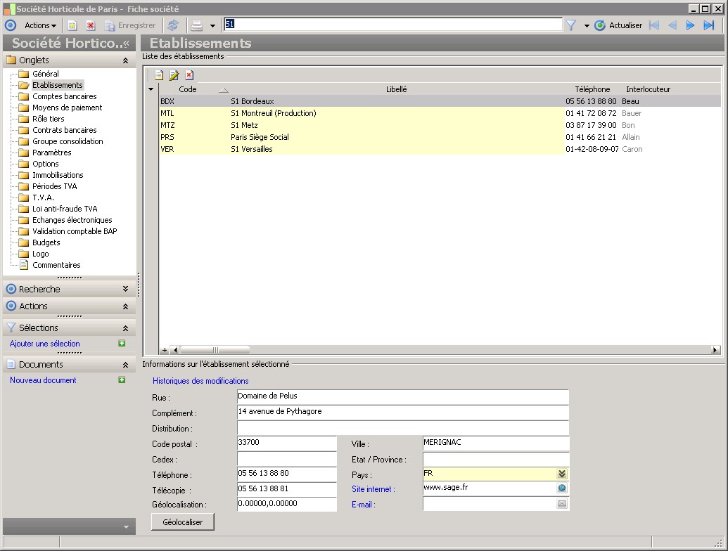 Dans la fenêtre Fiche société, la présence des fonctions décrites dans ce contexte dépend des applications installées. |