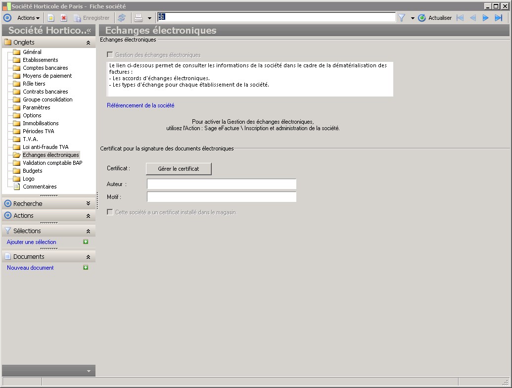 Cette case à cocher indique si la société gère les échanges électroniques.Elle est active si un des établissements de la société accepte l'échange électronique. |