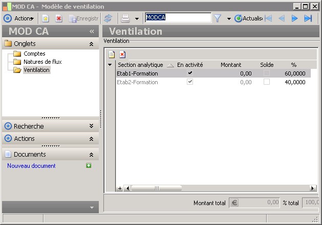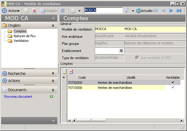 Il existe un ordre de priorité pour l'application du modèle de ventilation : - l'application cherche d'abord s'il existe un modèle de ventilation rattaché au compte général de l'écriture, - l'application cherche ensuite s'il existe un modèle de ventilation rattaché à la nature de flux liée au compte général de l'écriture, - l'application cherche enfin s'il existe un modèle de ventilation paramétré pour l'axe analytique. |