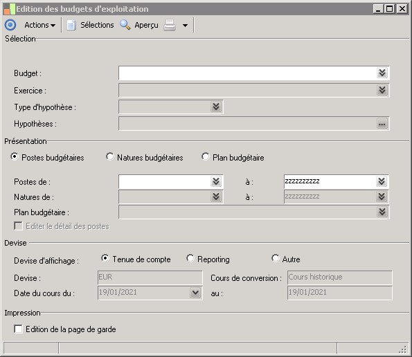 L'édition présente par poste, nature ou plan budgétaire et par dimension temps (ex : par mois) le montant budgété en fonction du budget et del'hypothèse sélectionnée.
