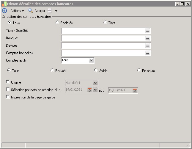 L'édition détaillée des comptes permet de visualiser, pour chaque compte bancaire, sa date de création, son statut et l'opérateur responsable de sa création.