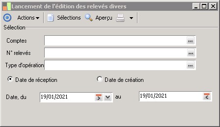 Vous pouvez sélectionner les relevés par comptes, numéros de relevés, type d'opération, et date de réception ou de création. Pour consulter les relevés issus de la sélection, cliquer sur le bouton Aperçu. Pour imprimer les relevés, cliquer sur le bouton/menu Imprimer.
