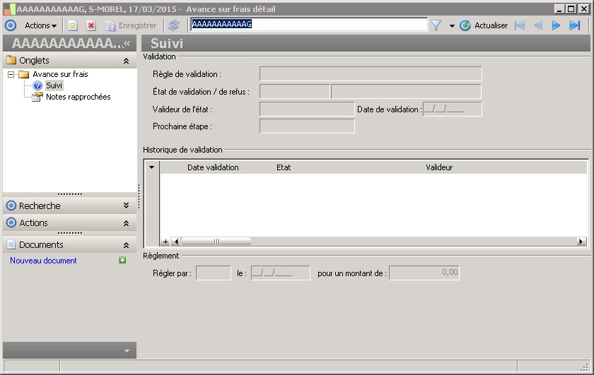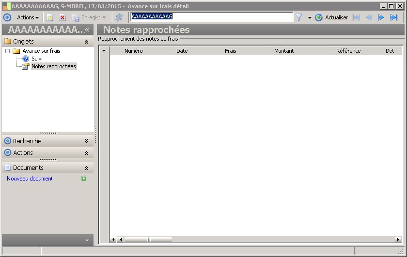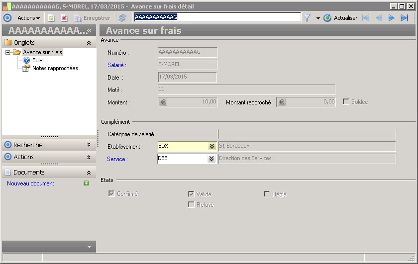 (Sage FRP 1000 Suite Financière) Menu Notes de Frais > Avances sur frais > Avance sur frais détail