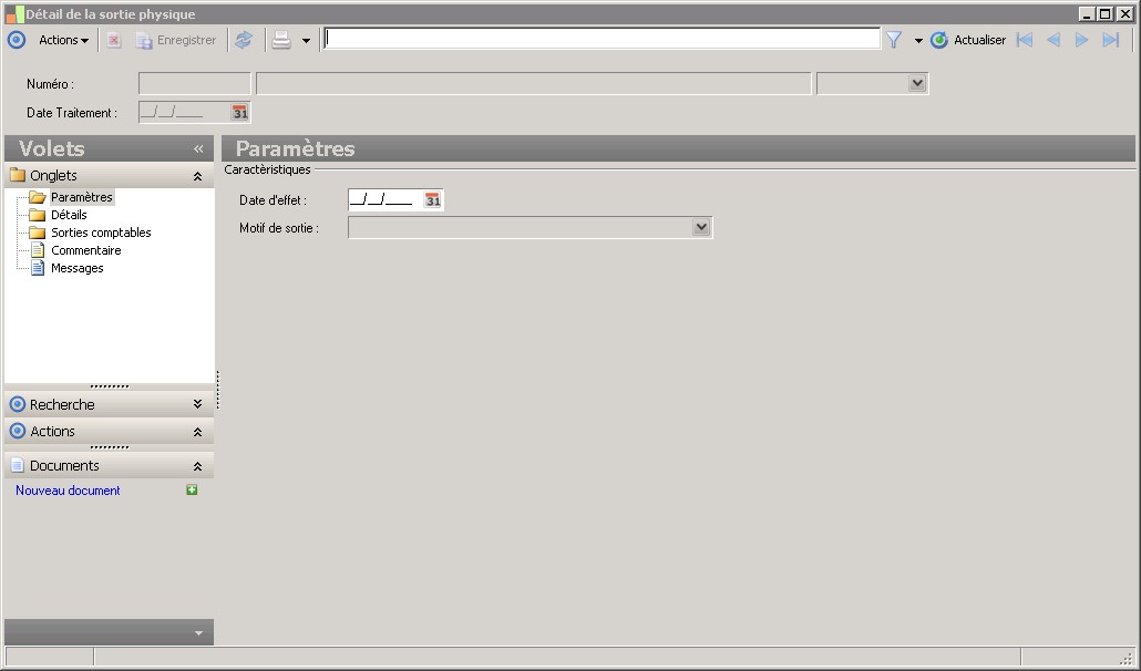(Sage FRP 1000 Suite Financière) Menu Immobilisations > Suivi comptable > Biens > Détail de la sortie physique