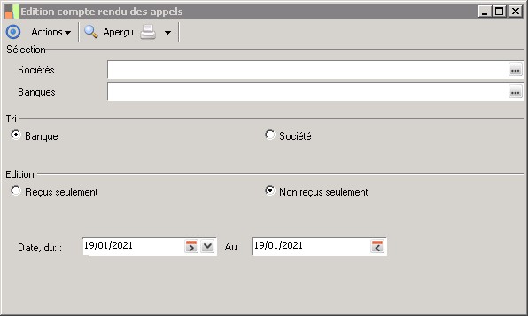(Sage FRP 1000 Comptabilité) Menu Banque Paiement > Relevés et Notifications > Relevés de comptes > Edition compte rendu des appels
