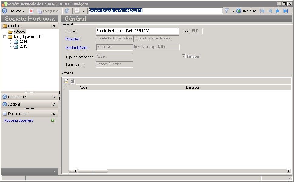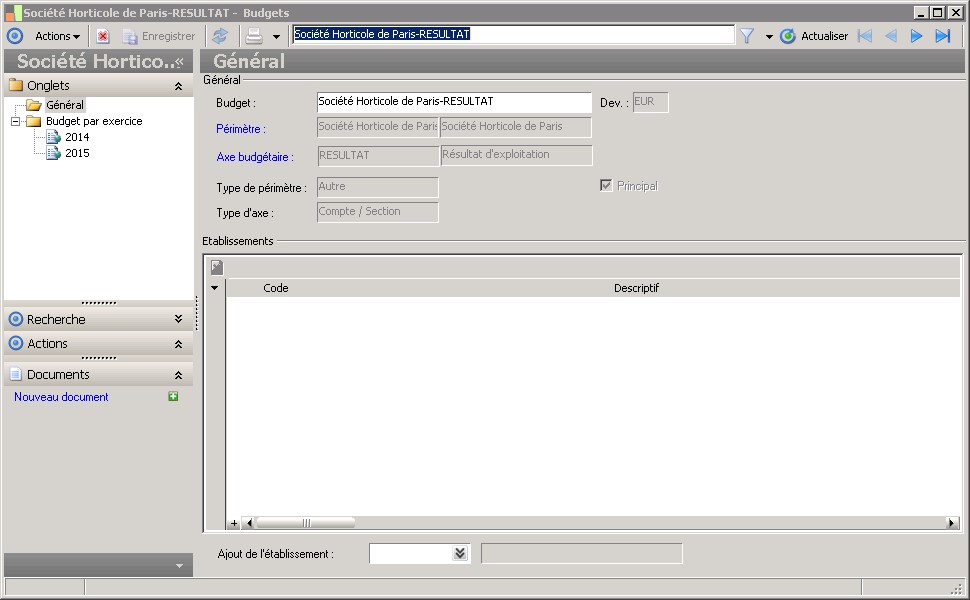 L'entrée Général vous donne les caractéristiques du budget considéré, tandis que l'entrée Budget par exercice permet de rattacher des exercices à ce budget.