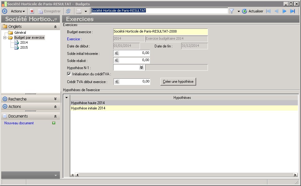 Vous devez ensuite saisir dans l'encart Exercice s du panneau de droite les différentes caractéristiques du budget par exercice :
