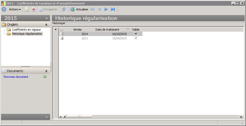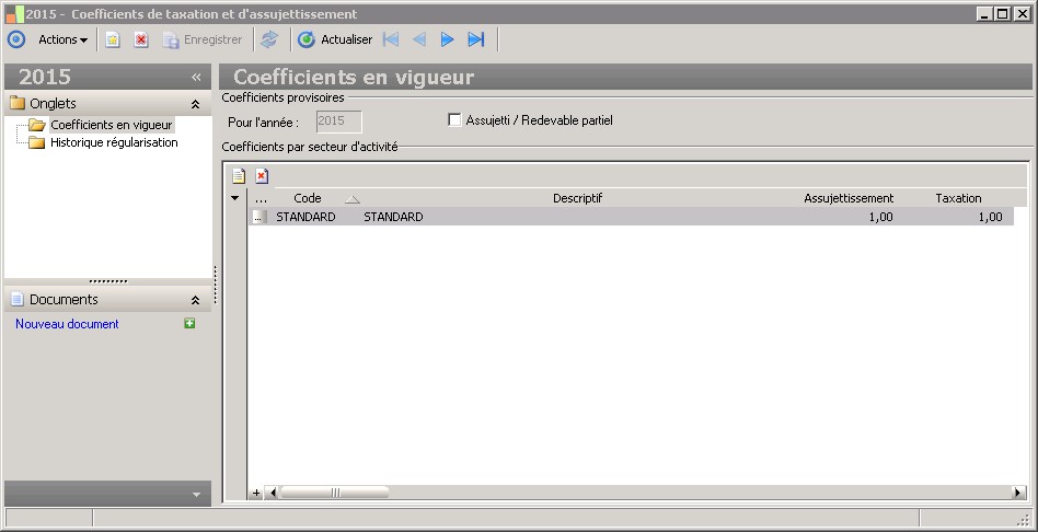 Cette zone indique l'année pour laquelle sont définis les coefficients provisoires. Lors de la création des premiers coefficients provisoires, l'année civile proposée correspond au premier exercice ouvert. |