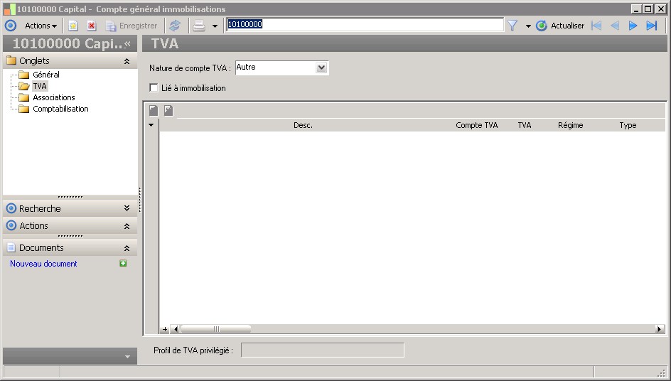 L'attribut nature de compte précise les relations entre le compte général et la TVA lorsque ce compte est lié à la gestion de la TVA. On a le choix entre plusieurs natures:- TTC : cette nature s'applique plus particulièrement aux comptes collectifs (par ex. : clients, fournisseurs)- HT : cette nature s'applique aux comptes de bilan ou de gestion (immobilisations, classe 6 et 7) -TVA : cette nature s'applique aux comptes enregistrant la TVA.- Autre : pour tous les comptes ne permettant pas de gérer la TVA.Si la nature du compte est HT, il faut obligatoirement indiquer un ou plusieurs profils de TVA (dont un déclaré privilégié). Dans le contexte de la comptabilité, ce profil de TVA permettra le calcul et la comptabilisation automatique de la TVA en saisie. |
