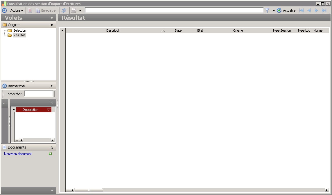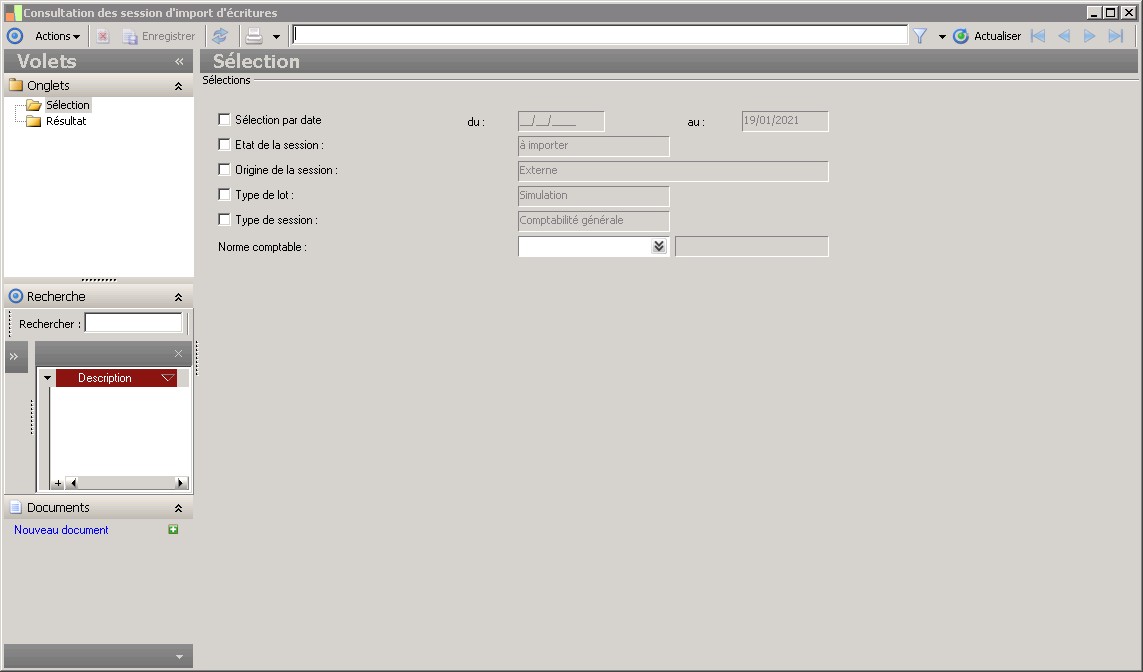 (Sage FRP 1000 Comptabilité) Menu Immobilisations > Arrêtés comptables > Consultation des session d'import d'écritures