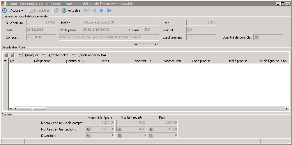 La modification du montant sur une écriture de TVA est sans incidence sur les détails d'écriture des écritures de HT : vous devez les modifier manuellement le cas échéant.