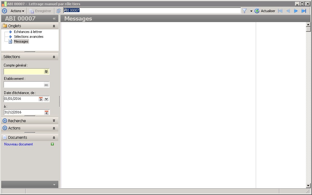 Le compte général permet de sélectionner le compte général lettrable ou le compte général collectif sur lequel va être effectué le lettrage.Le type de collectif du compte général doit être en adéquation avec le rôle tiers sélectionné en cas de lettrage par rôle tiers. |
