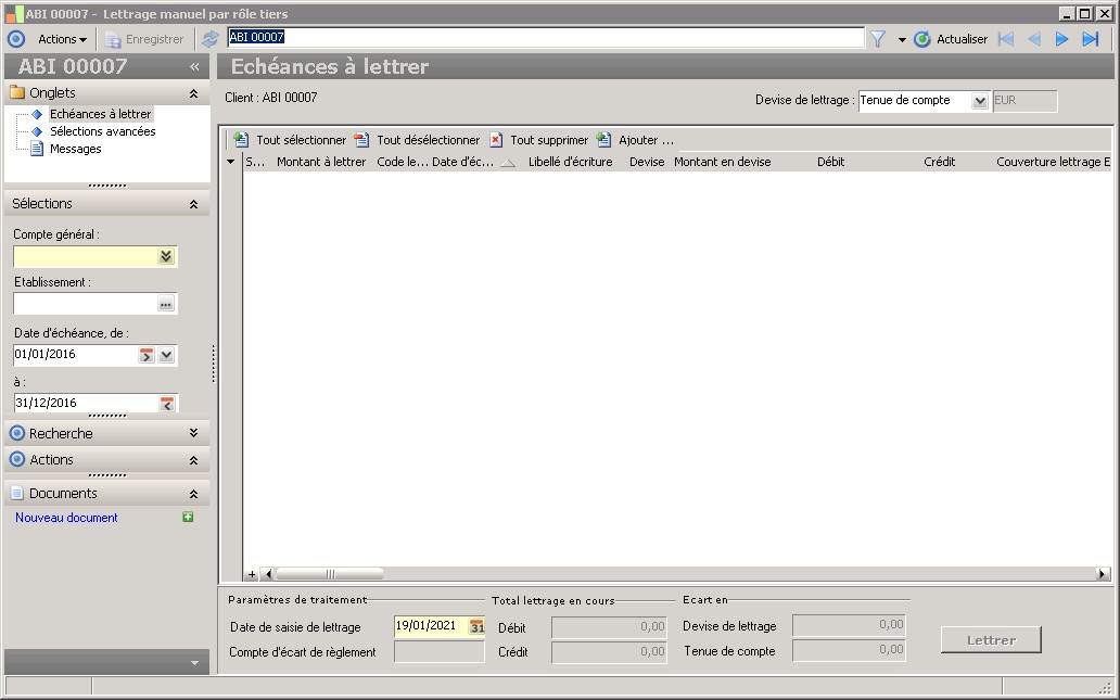 Ce montant indique l'écart de lettrage constaté dans la devise de lettrage : il correspond à la différence entre le total débit et le total crédit des échéances sélectionnées. |